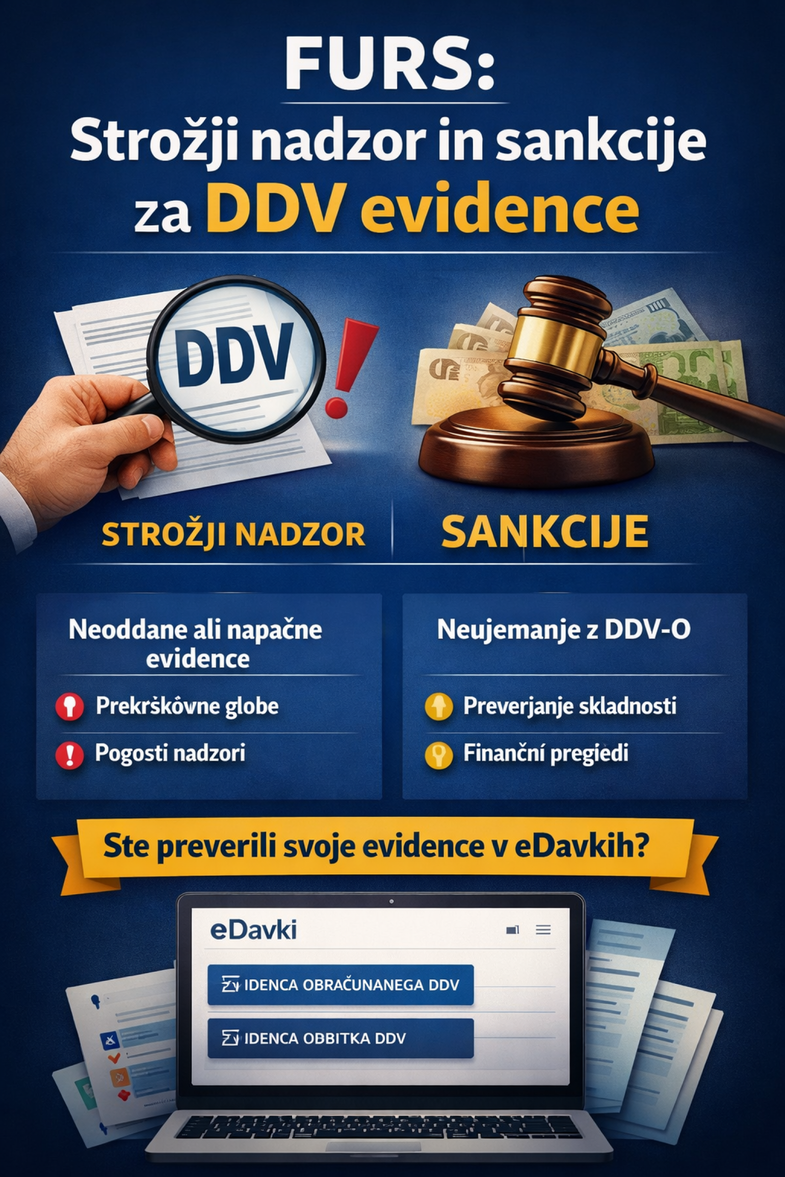 Finančna uprava RS napoveduje strožji nadzor in mesečno prekrškovno sankcioniranje davčnih zavezancev, ki ne predložijo obveznih evidenc obračunanega DDV in evidenc odbitka DDV oziroma kadar se podatki v evidencah ne ujemajo z obračunom DDV-O.