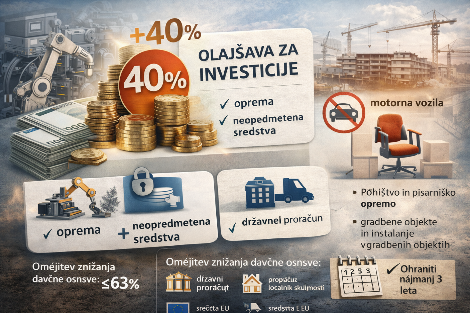 Davčni zavezanci lahko v skladu z 55.a členom ZDDPO-2 (ter smiselno tudi po 66.a členu ZDoh-2) uveljavljajo olajšavo za investiranje, ki omogoča znižanje davčne osnove zaradi vlaganj v določena sredstva.