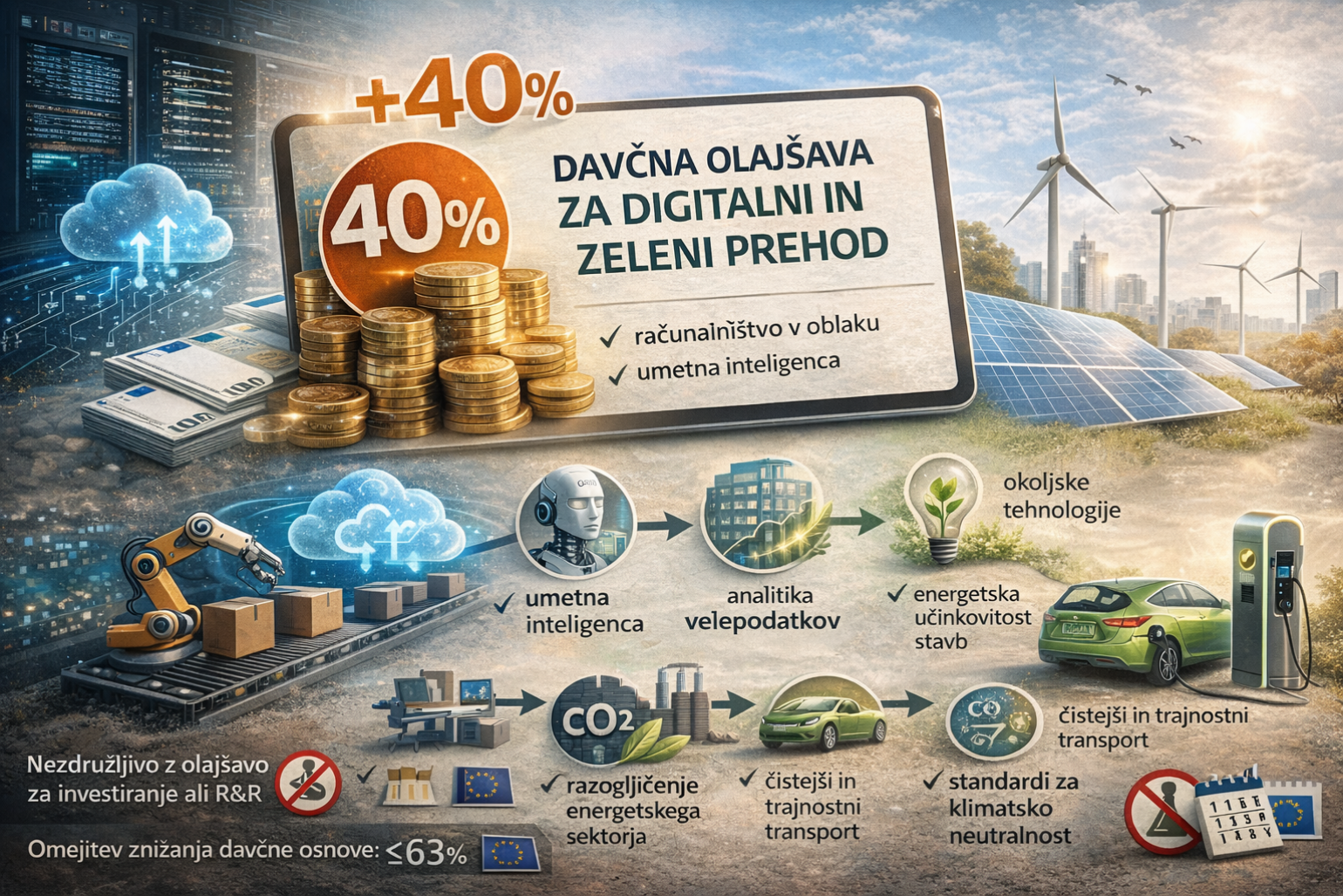 Davčni zavezanci lahko v skladu s 55.c členom ZDDPO-2 (ter smiselno tudi po 65.a členu ZDoh-2) uveljavljajo posebno davčno olajšavo za vlaganja v digitalni in zeleni prehod. Namen te olajšave je spodbujanje trajnostnih poslovnih modelov, digitalne preobrazbe podjetij ter prehoda v podnebno nevtralno gospodarstvo.