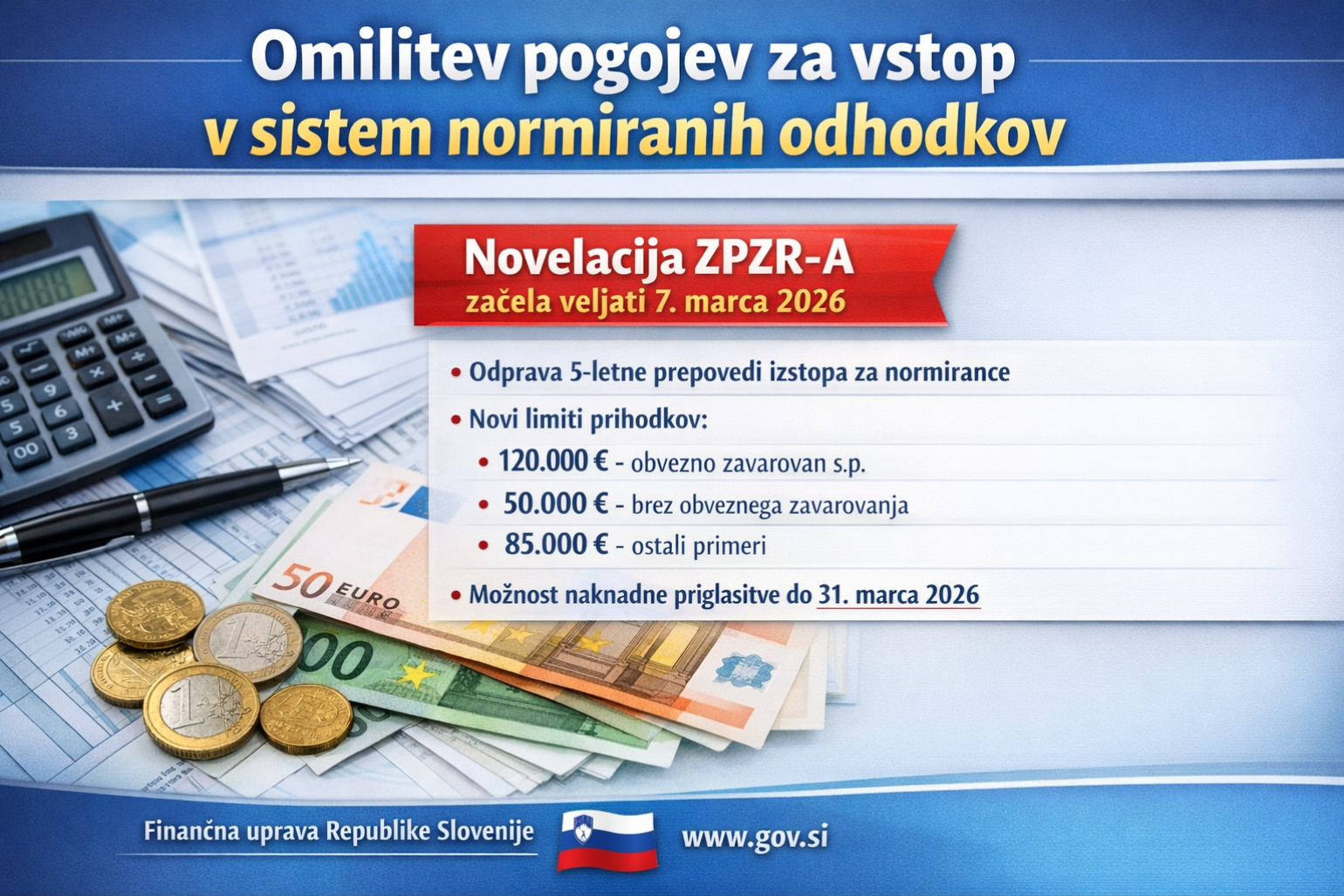marca 2026 je začela veljati novela ZPZR-A, ki določa blažje pogoje za vstop oziroma ohranitev ugotavljanja davčne osnove z upoštevanjem normiranih odhodkov. Uporablja se že v letu 2026. Med drugim je bila odpravljena tudi petletna prepoved vstopa v sistem normiranosti zaradi prenehanja opravljanja dejavnosti oziroma izstopa iz sheme normiranih odhodkov.