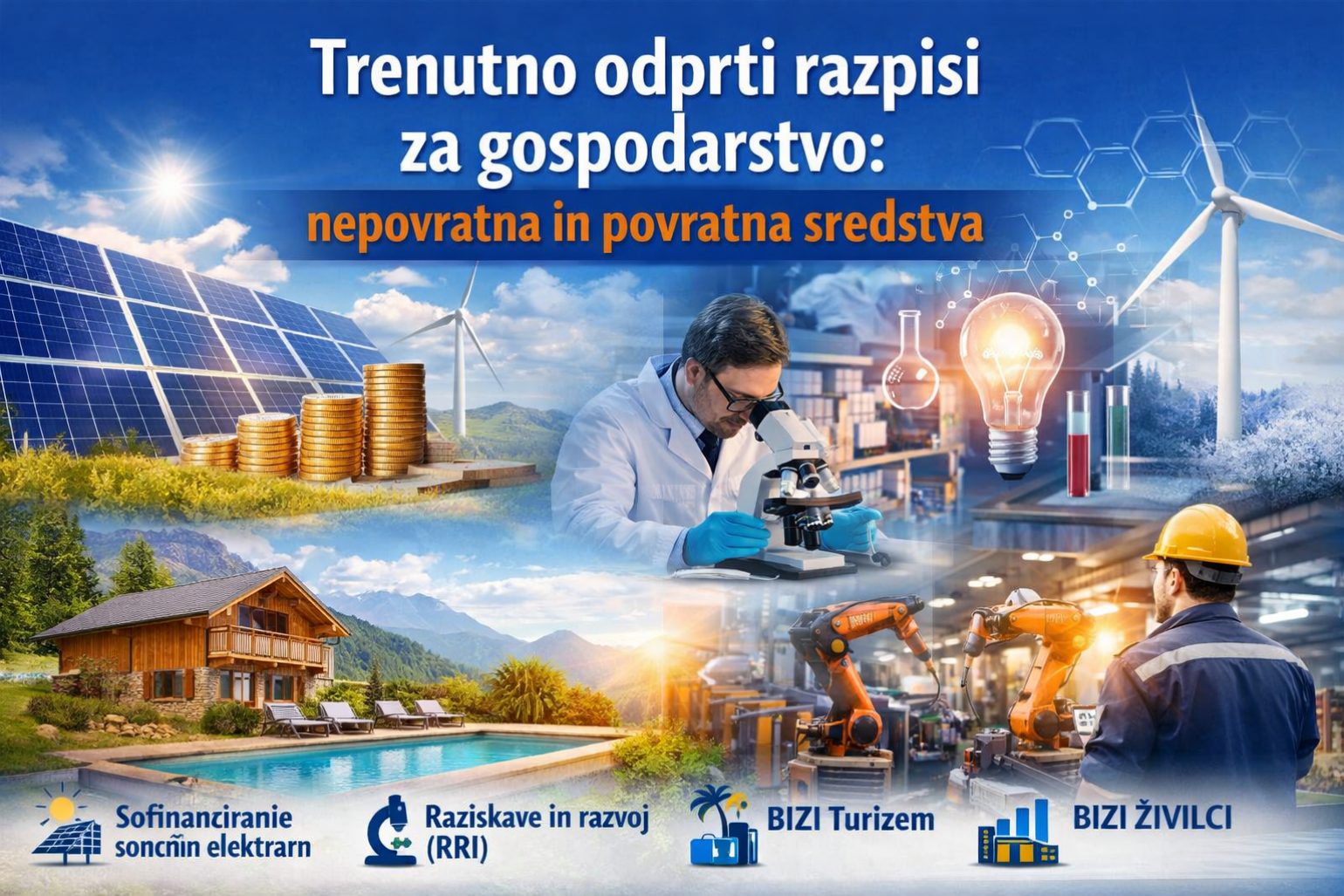 V nadaljevanju predstavljamo pregled izbranih aktualnih možnosti financiranja za gospodarstvo, skupaj s ključnimi informacijami, ki lahko pomagajo pri prvi presoji, ali je posamezen razpis primeren za vaše podjetje.
